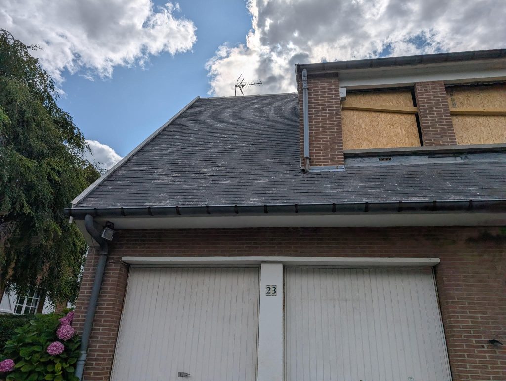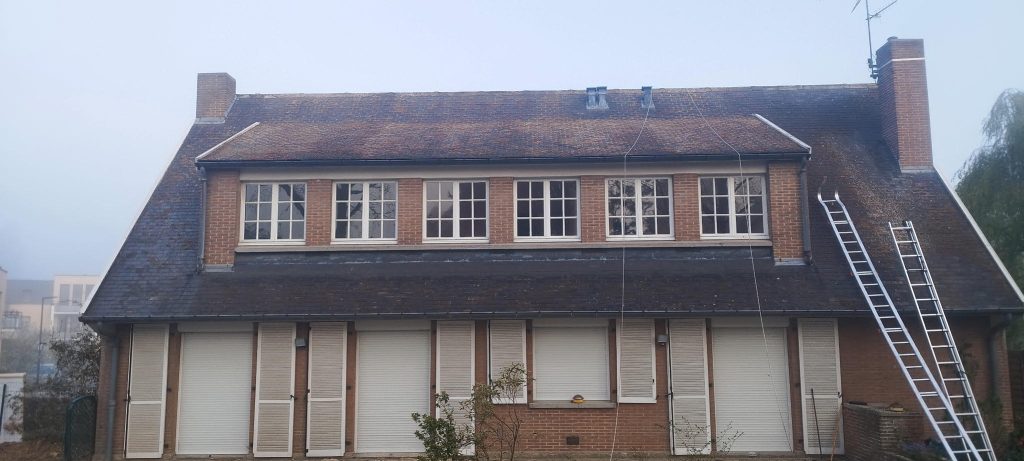 Dans le cadre de ce chantier réalisé à Lille, nous sommes intervenus sur une toiture en ardoises fibro-ciment contenant de l’amiante. Bien que la couverture soit restée en bon état général, elle présentait une forte présence de lichens ainsi qu’un encrassement dû à la pollution.