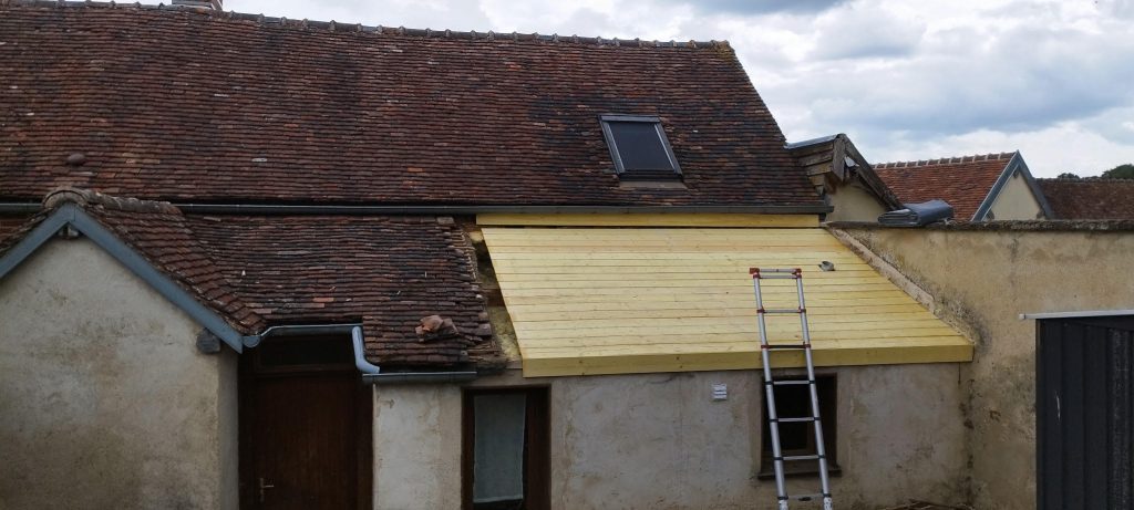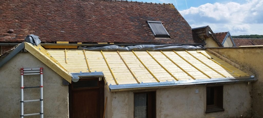 Nous avons ensuite réalisé une mise à niveau de la charpente, permettant d’obtenir une pente conforme et adaptée. Une volige en bois a été mise en place afin de créer un support continu, idéal pour recevoir une nouvelle couverture.
