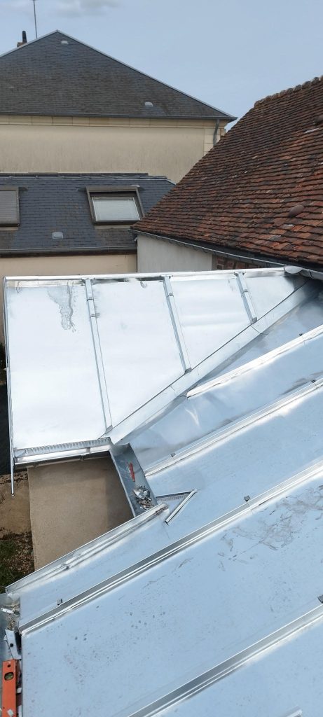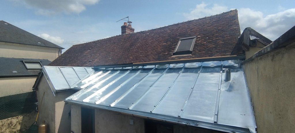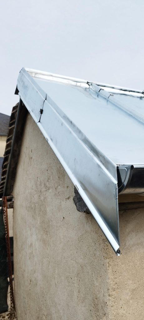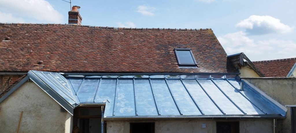 Le choix s’est porté sur une toiture en zinc, particulièrement adaptée aux faibles pentes. La pose a été accompagnée de la réalisation minutieuse de l’ensemble des raccords, garantissant une étanchéité optimale et une finition soignée.